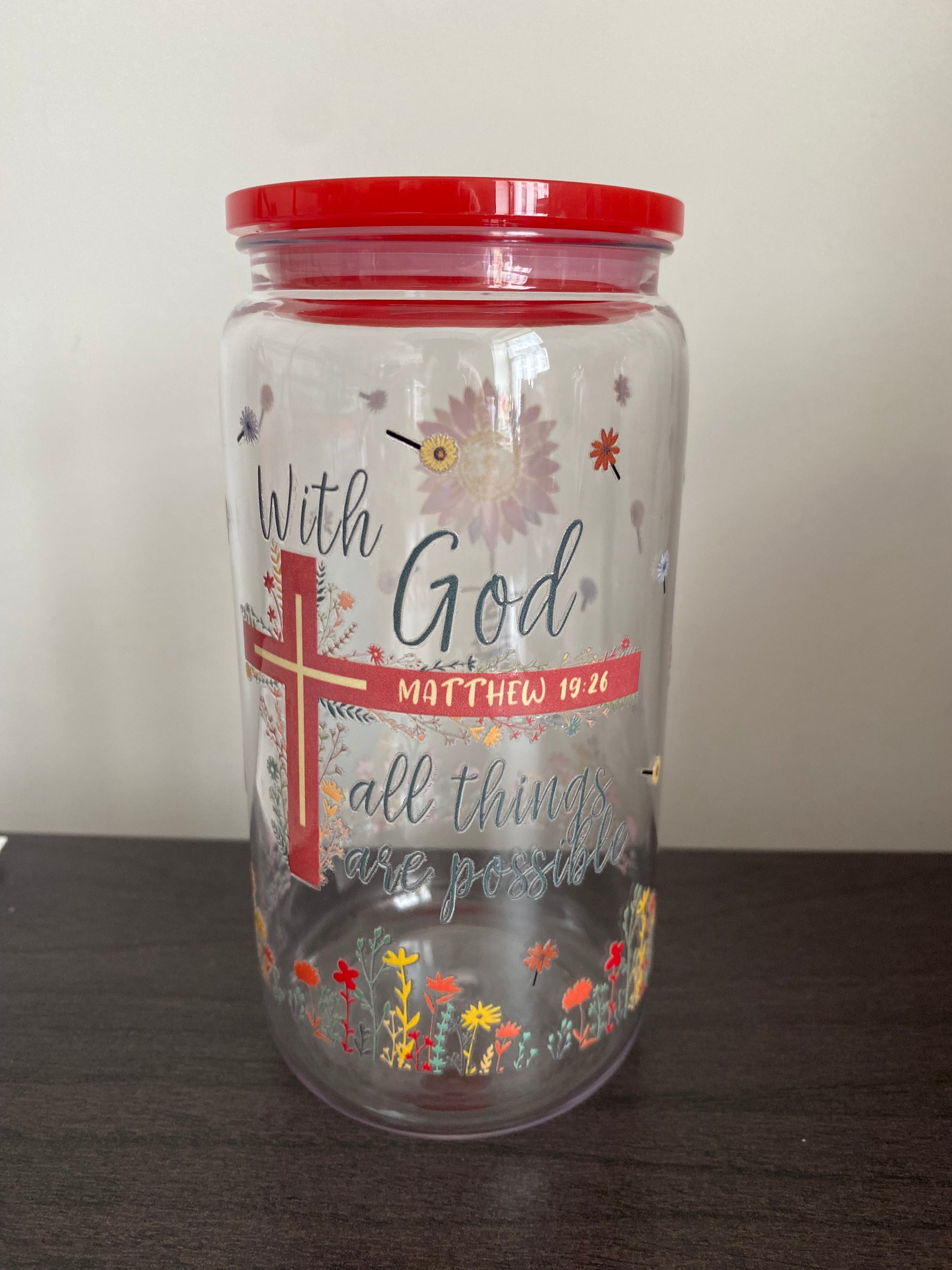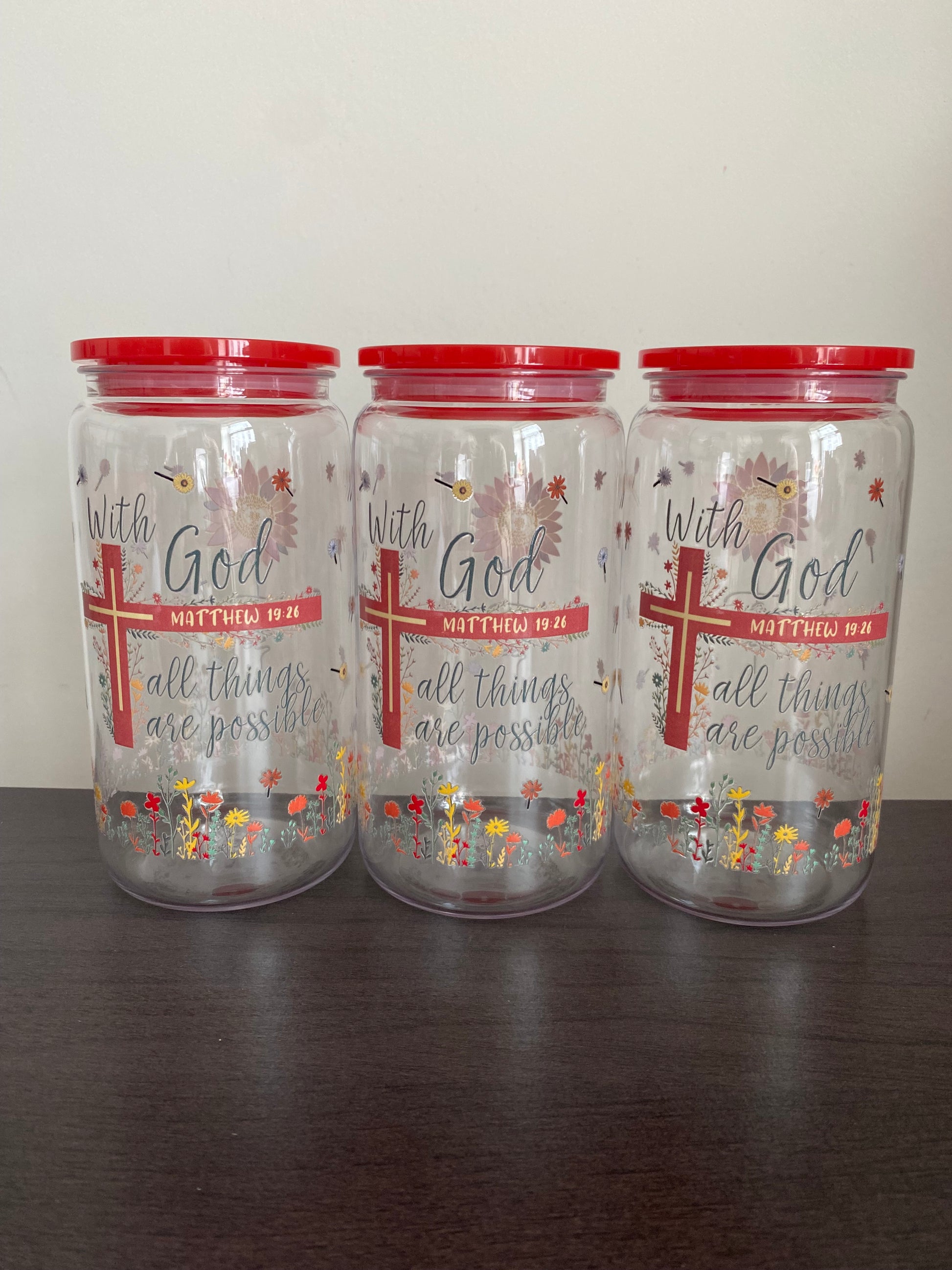 Decorated with the reassuring words of Matthew 19:26, "With God all things are possible," this tumbler serves as a source of encouragement and strength. The elegant script wraps around the tumbler, making it a meaningful gift or personal keepsake for anyone seeking inspiration.