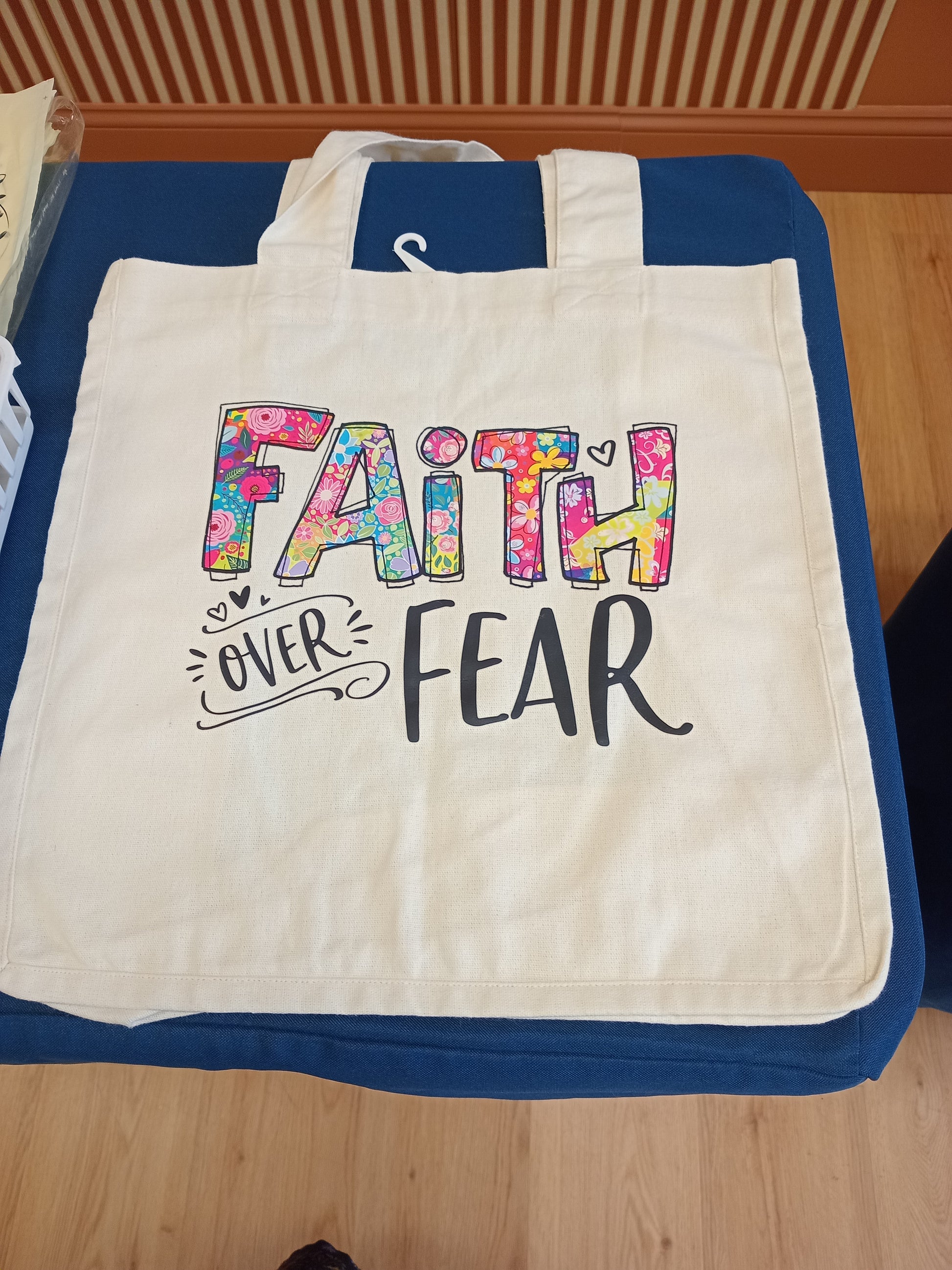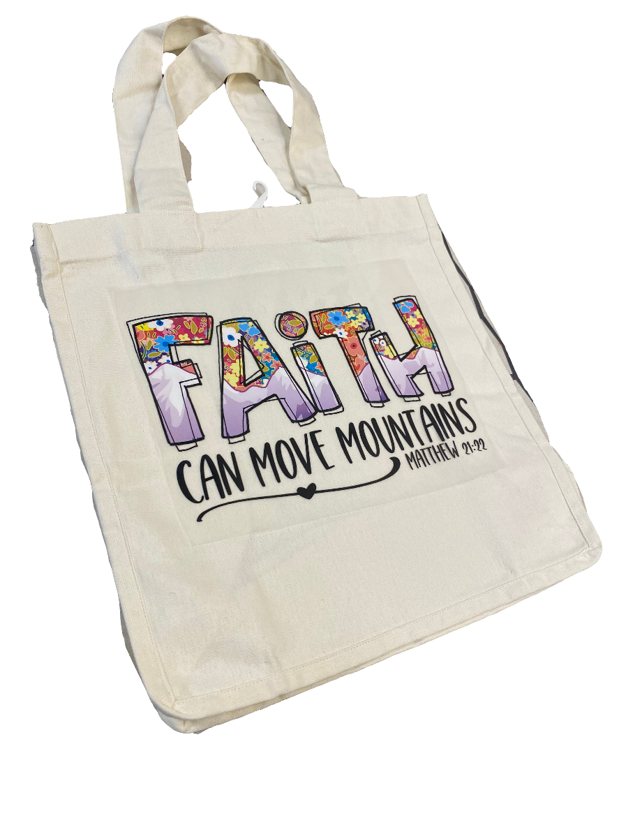 Our durable cotton tote bags measure 13" x 14" x 7" and feature a faith-inspired quote. Perfect for everyday use and spreading a positive message, this tote bag is a must-have for those who value both style and faith.