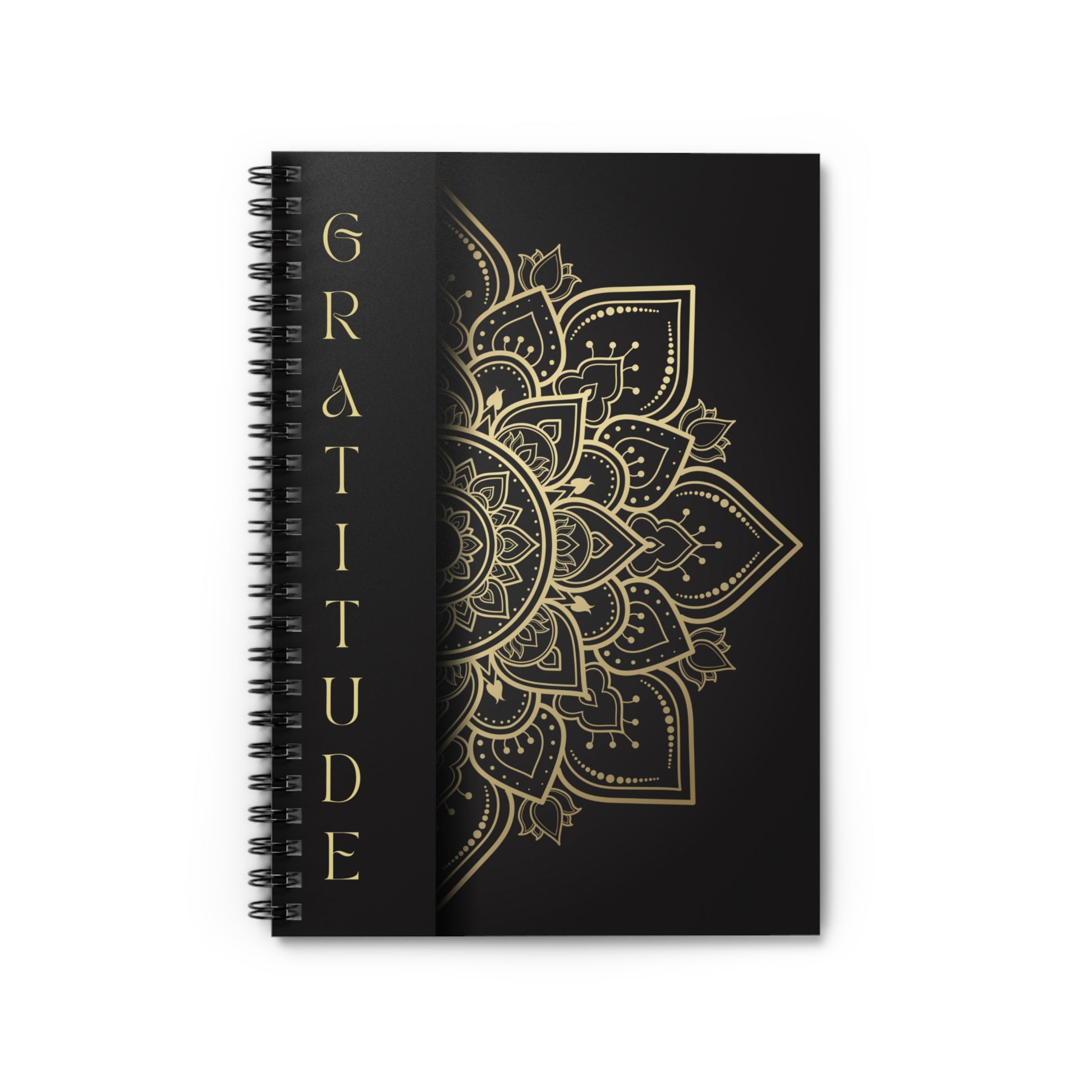 Cultivate a mindset of positivity and abundance with our Gratitude Journal. This elegantly designed spiral notebook features a sleek black cover adorned with an intricate gold mandala, symbolizing balance, harmony, and self-reflection. The word GRATITUDE is boldly displayed along the side, serving as a daily reminder to appreciate life’s blessings.