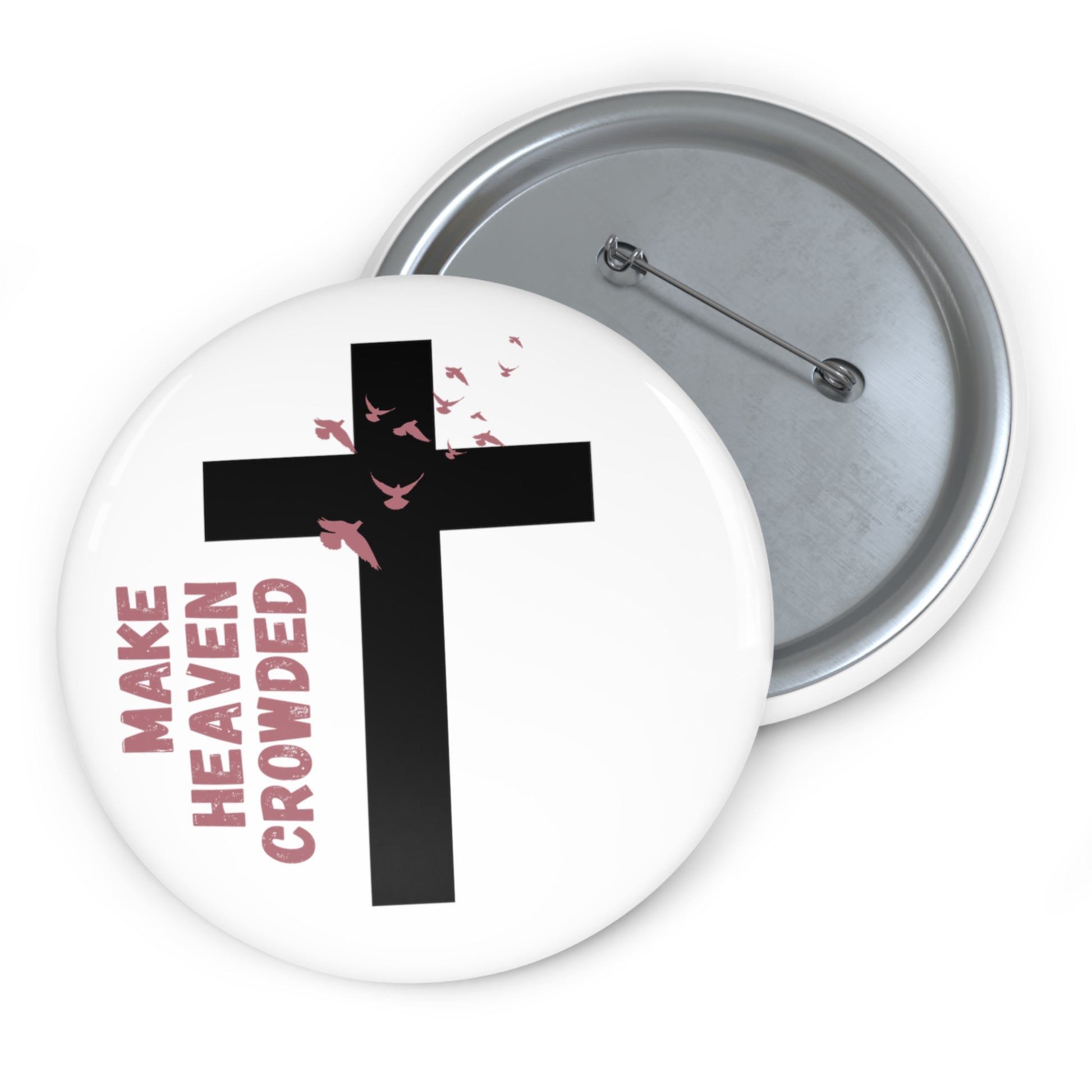 Our Make Heaven Crowded Pin Buttons are made from metal, yet are lightweight and durable with a strong safety pin.